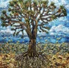 Art gallery exhibit featuring textured paintings of natural landscapes and organic elements. Four paintings are visible, depicting a tree, plants, a tree trunk, and intricate root structures. White walls and ceiling with spotlights illuminate the art